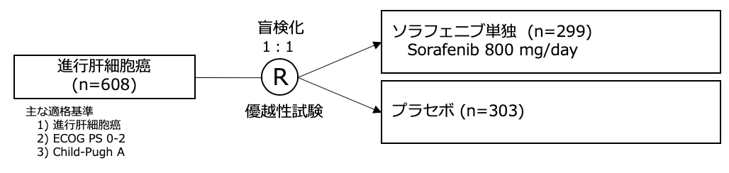 - 2005年3月から2006年4月の間に、602例が登録され、299例がソラフェニブ群に、303例がプラセボ群に割り付けられた。